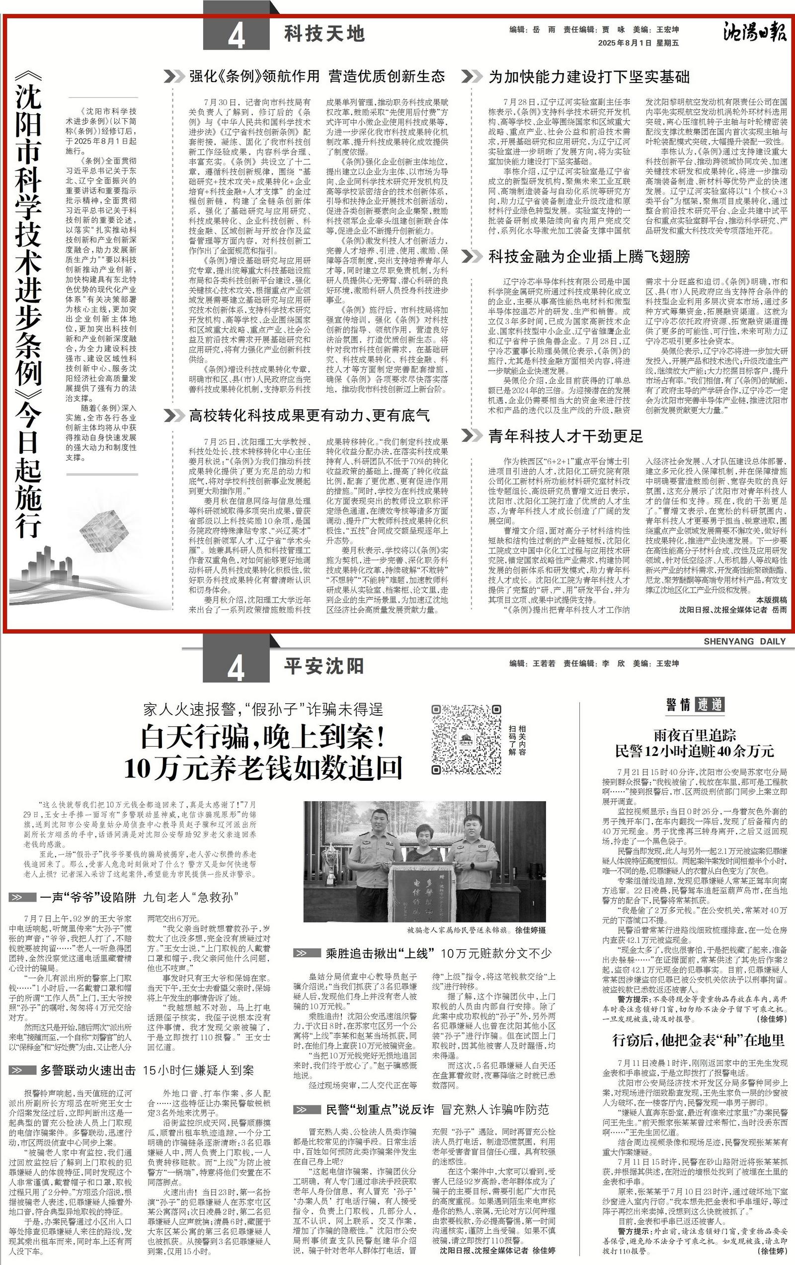 7月25日,沈阳理工大学教授、科技处处长、技术转移转化中心主任姜月秋说:“《条例》为我们推动科技成果转化提供了更为充足的动力和底气,将对学校科技创新事业发展起到更大助推作用。”