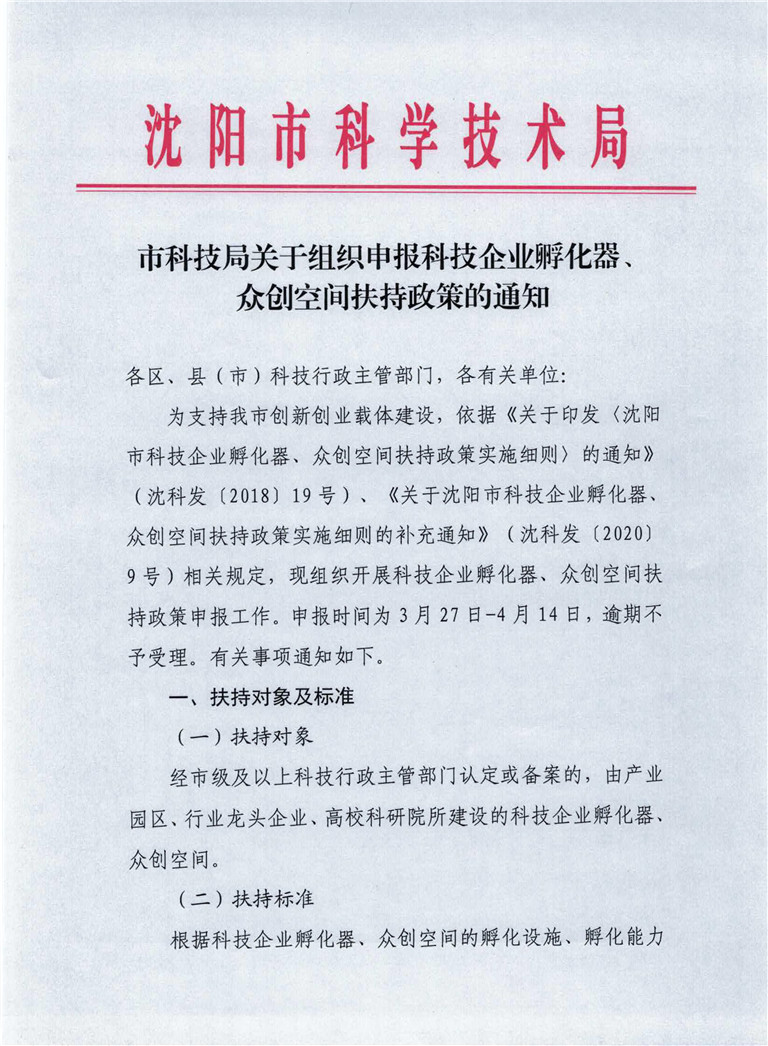 亚洲体育博彩平台关于组织申报科技企业孵化器、众创空间扶持政策的通知