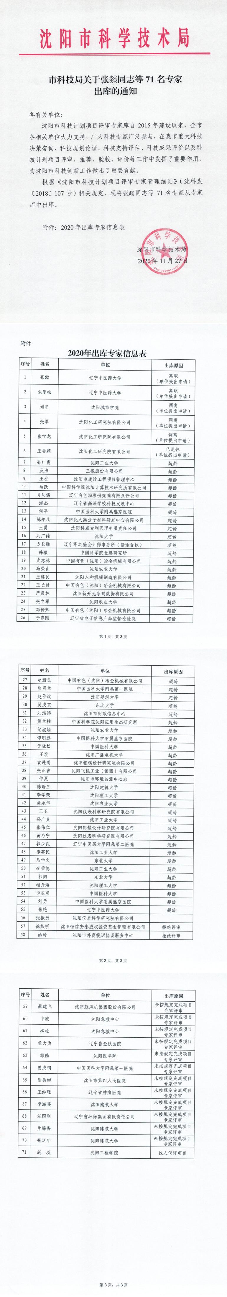 亚洲体育博彩平台关于张燚同志等 71 名专家出库的通知