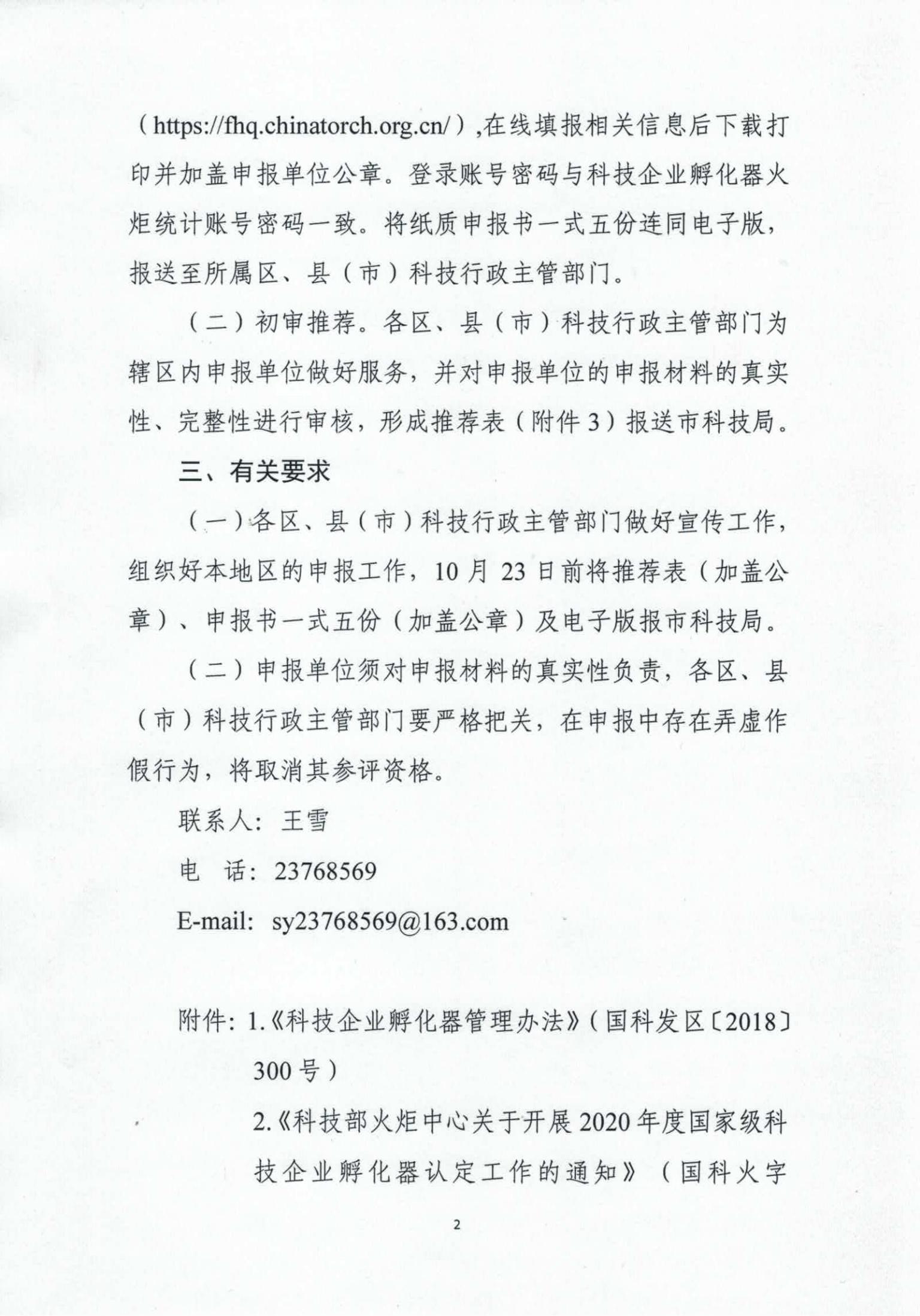 附件2:科技部火炬中心关于开展2020年度国家级科技企业孵化器认定工作的通知国科火字〔2020〕166号.pdf