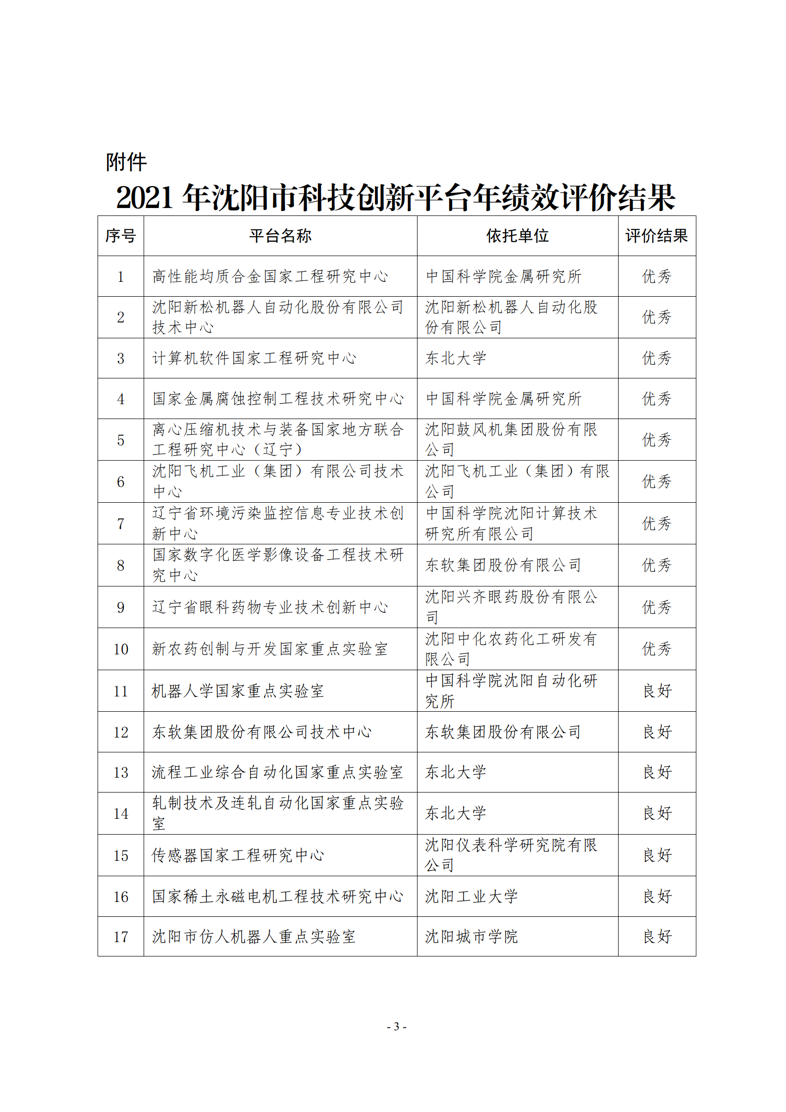 为推动我市科技创新平台在提升科技创新能力、支撑和服务产业创新发展等方面取得新突破,根据《关于提升科技创新平台能力支撑产业高质量发展的行动方案》(沈科创办发〔2021〕1号)有关要求,亚洲体育博彩平台对纳入平台年建设并申报年度绩效评价的各级重点实验室、技术创新中心(工程技术研究中心)、工程研究中心(工程实验室)、企业技术中心开展了绩效评价工作。经各区、县(市)科技管理部门审查、亚洲体育博彩平台审核、专家评审、社会公示等程序,确定高性能均质合金国家工程研究中心等10个科技创新平台绩效评价结果为优秀;机器人学国家重点实验室等30个科技创新平台绩效评价结果为良好。对以上科技创新平台按有关政策规定分别予以奖励。