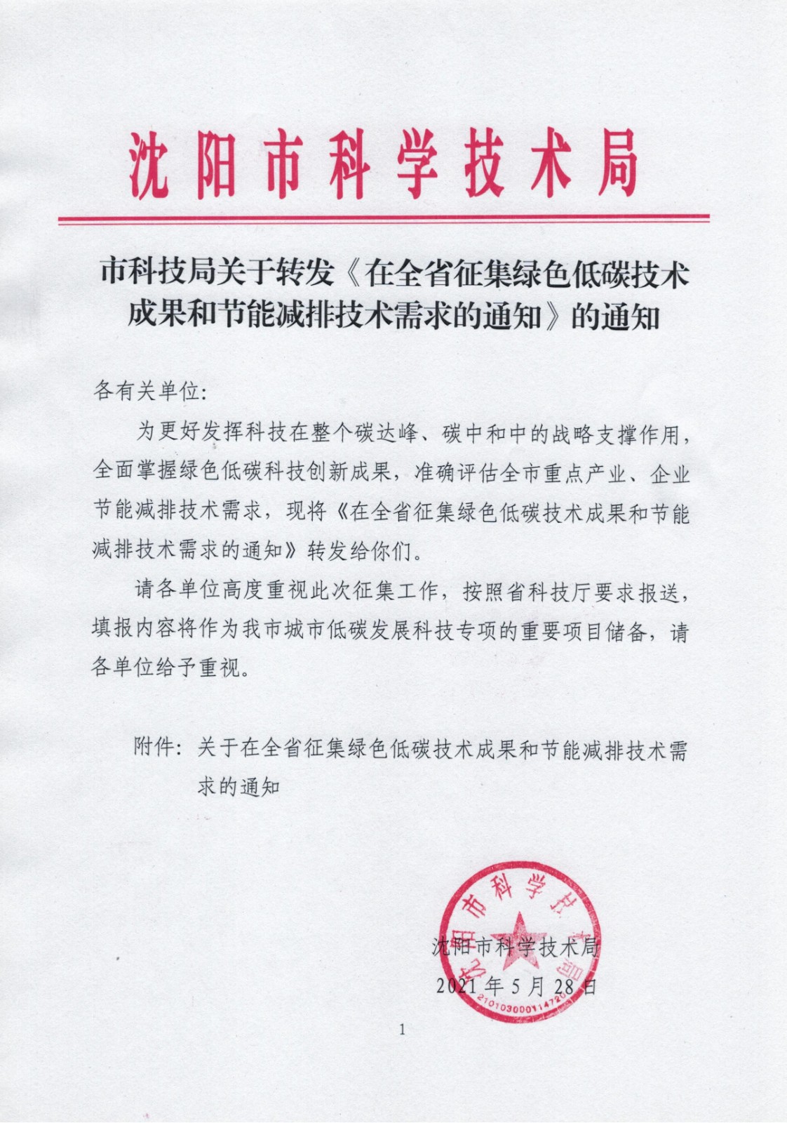 亚洲体育博彩平台关于转发《在全省征集绿色低碳技术成果和节能减排技术需求的通知》的通知