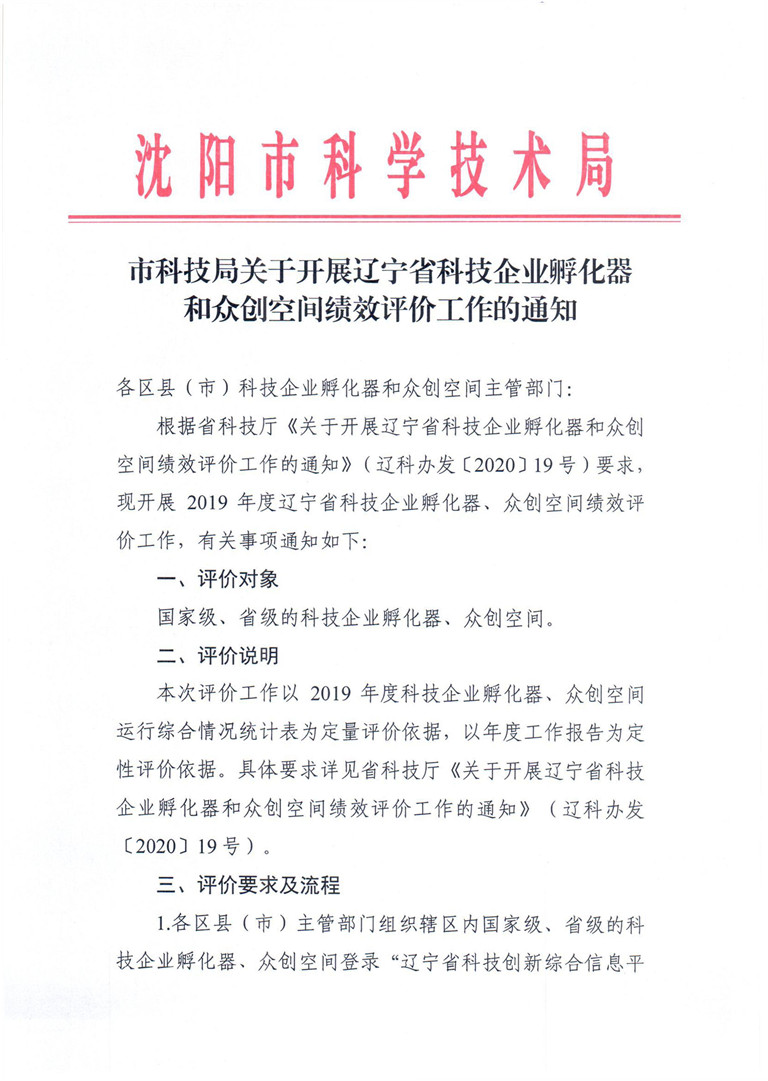 亚洲体育博彩平台关于开展辽宁省科技企业孵化器和众创空间绩效评价工作的通知